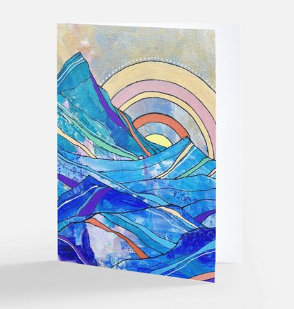 The sun rises over mountain ridges in this card made from an original arcylic painting by Wild Pines Owner Liz Swindell