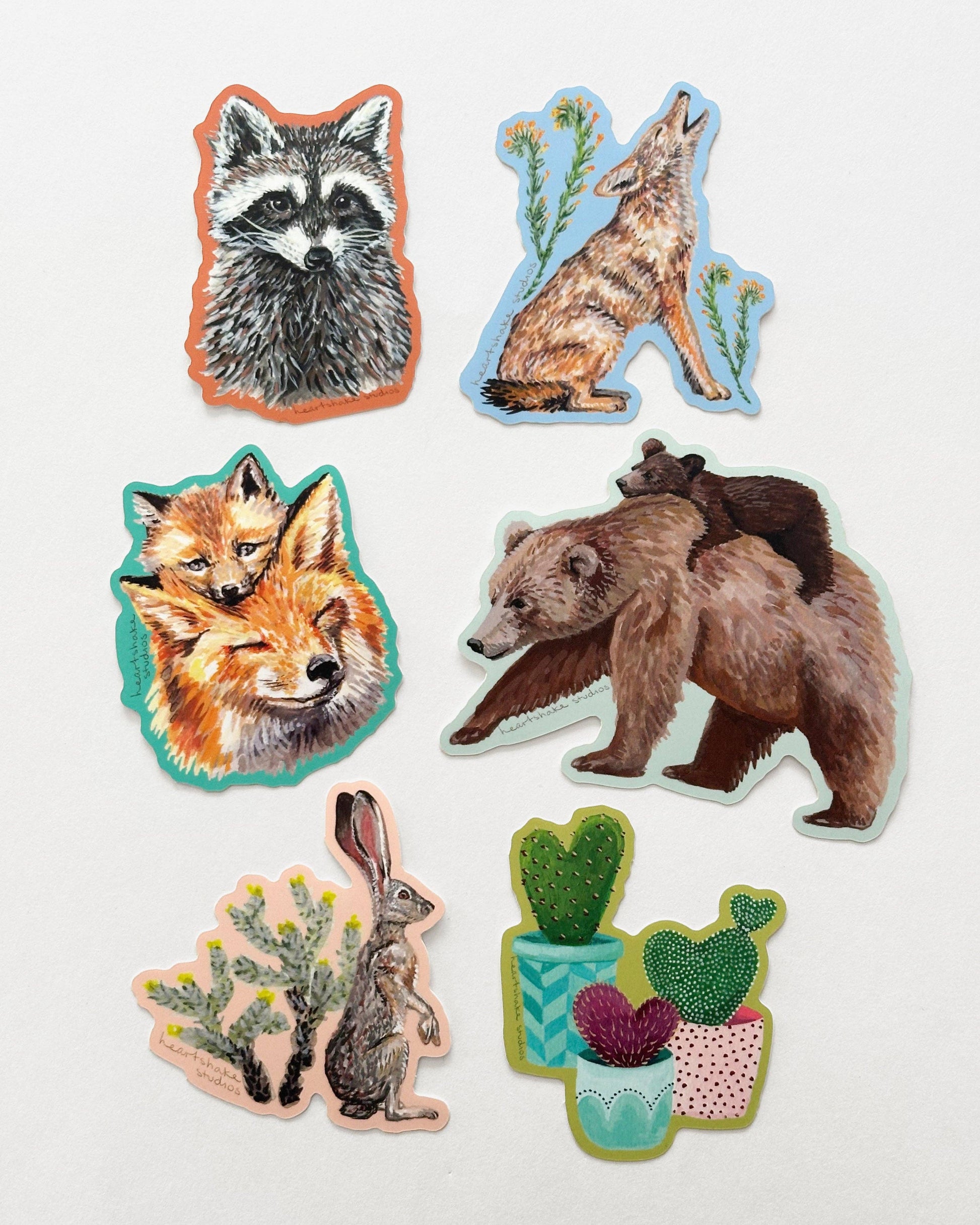 Cute sticker made from an original illustration by Kit Hutchinson of a coyote howling framed by a couple fiddleneck flowers on a blue background; the finely detailed coyote and wildflowers were originally painted by Kit with gouache paints. Professionally printed in Colorado on durable BOPP material with water-, oil-, and scratch-resistant matte lamination—perfect for both indoor and outdoor use.