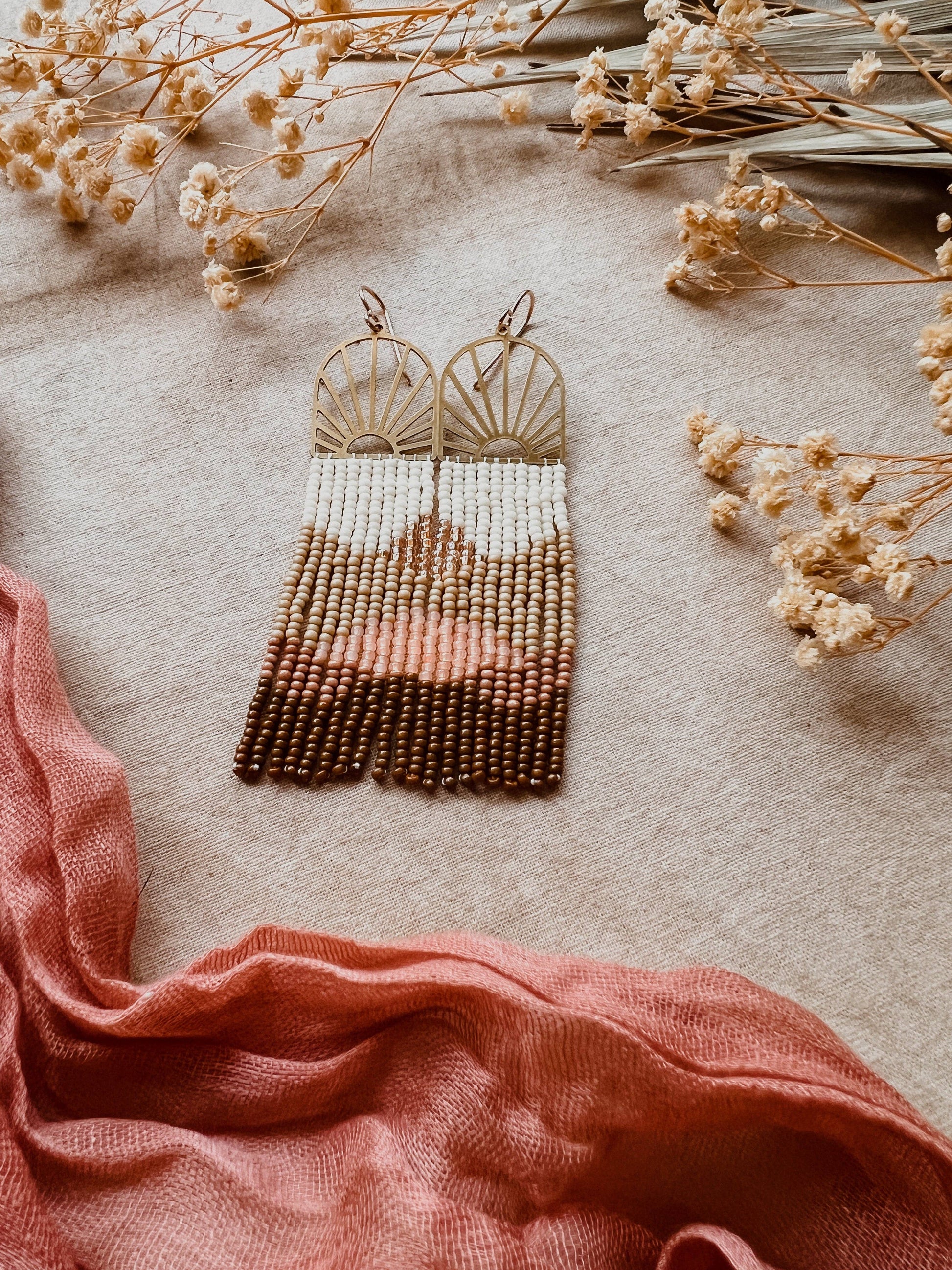 ✦ Handwoven with Japanese glass seed beads. Woven onto brass sunshine frames. Approximately 3.5 inches long. Comes on 14k gold fill ear wires . ✦ By Stone & Sky designs