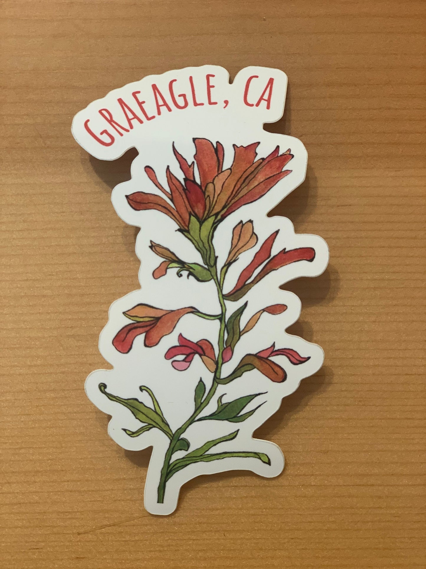 4.5"x2" high-quality, vinyl sticker depicting the art of local watercolor artist Kiana Loria. Indian Paintbrush wildflowers can be seen blanketing the mountains around Graeagle in the summer making this sticker the perfect way to capture a piece of the Lost Sierra. Waterproof and dishwasher-safe.