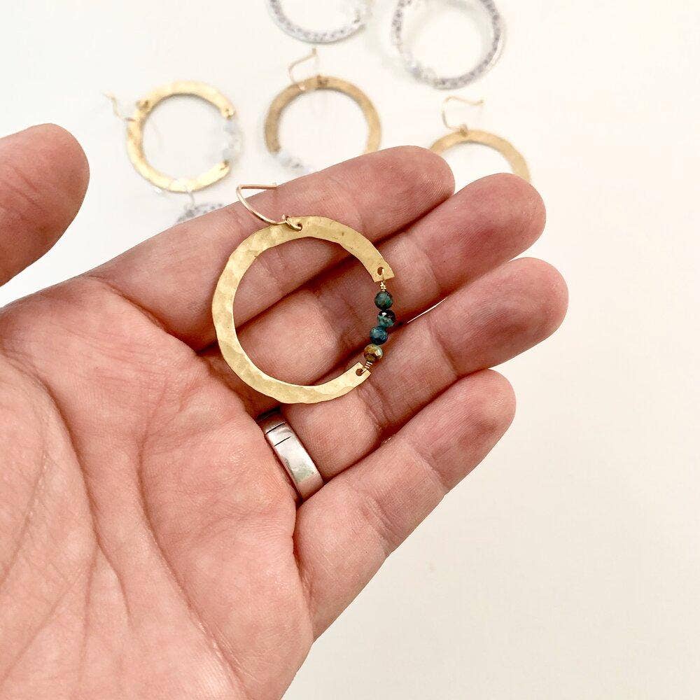 Gold hoops with turquoise beads that hang from 14 karat gold filled ear wire.