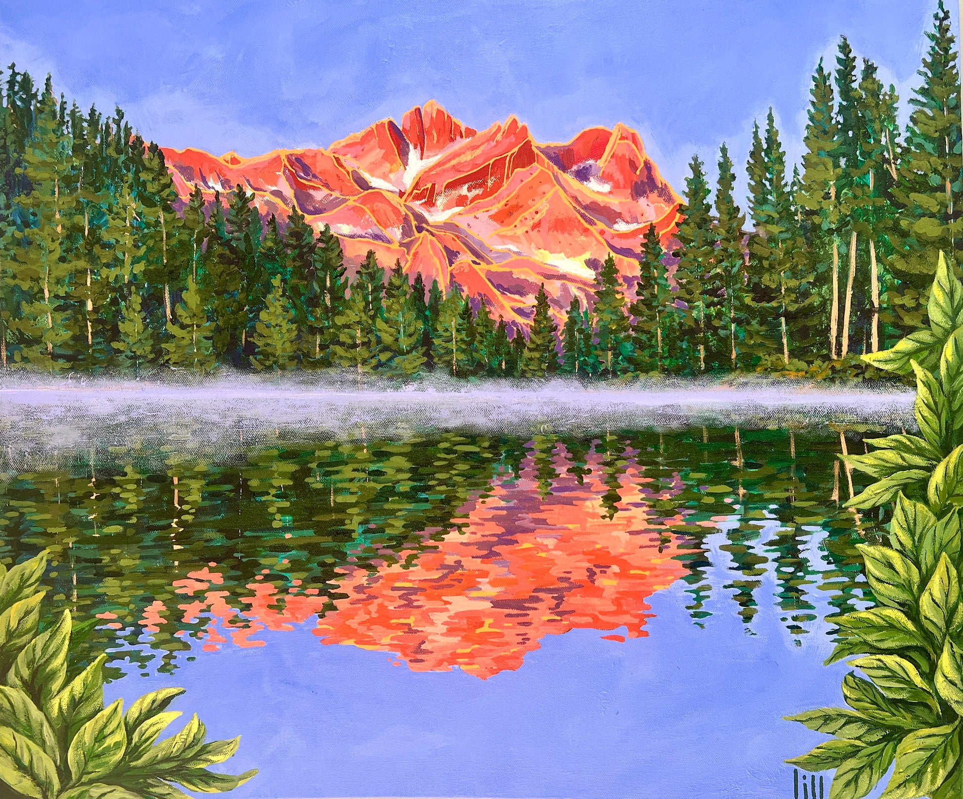 High-quality giclee print of an original acrylic painting of the Sierra Buttes reflecting in Sand Pond, captured in the early morning hour by photographer Tracy Spears and painted by Wild Pines Owner Liz Swindell