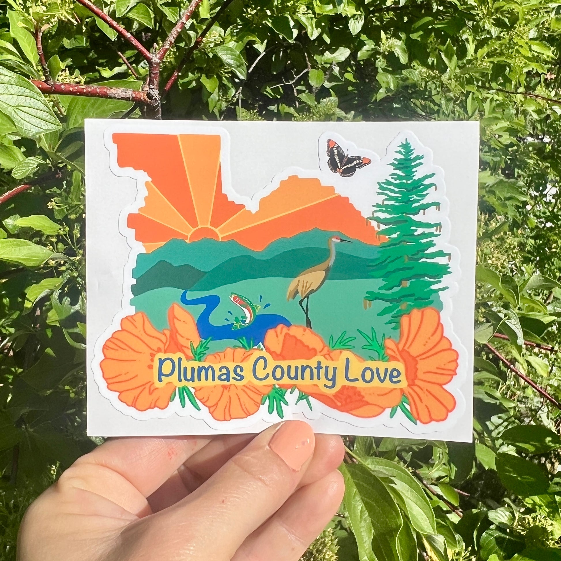 Show your love for Plumas County with This sticker created from the design of the newest mural on Main Street in Quincy painted by artists Liz Swindell and Trixie Hollyhox.
