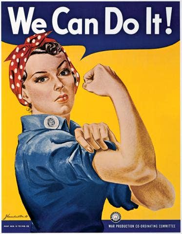 Rosie The Riveter. J. Howard Miller. Reproduction of WWII poster recruiting women for factory work. After the war the propaganda reversed, extolling the virtues of "homemaking." J. Howard Miller (1918 – 2004) was an American graphic artist. He painted posters during World War II to support the war effort, among them the famous "We Can Do It!" poster, frequently misidentified as Rosie the Riveter. Painting the poster. Miller was based in Pittsburgh during the war.