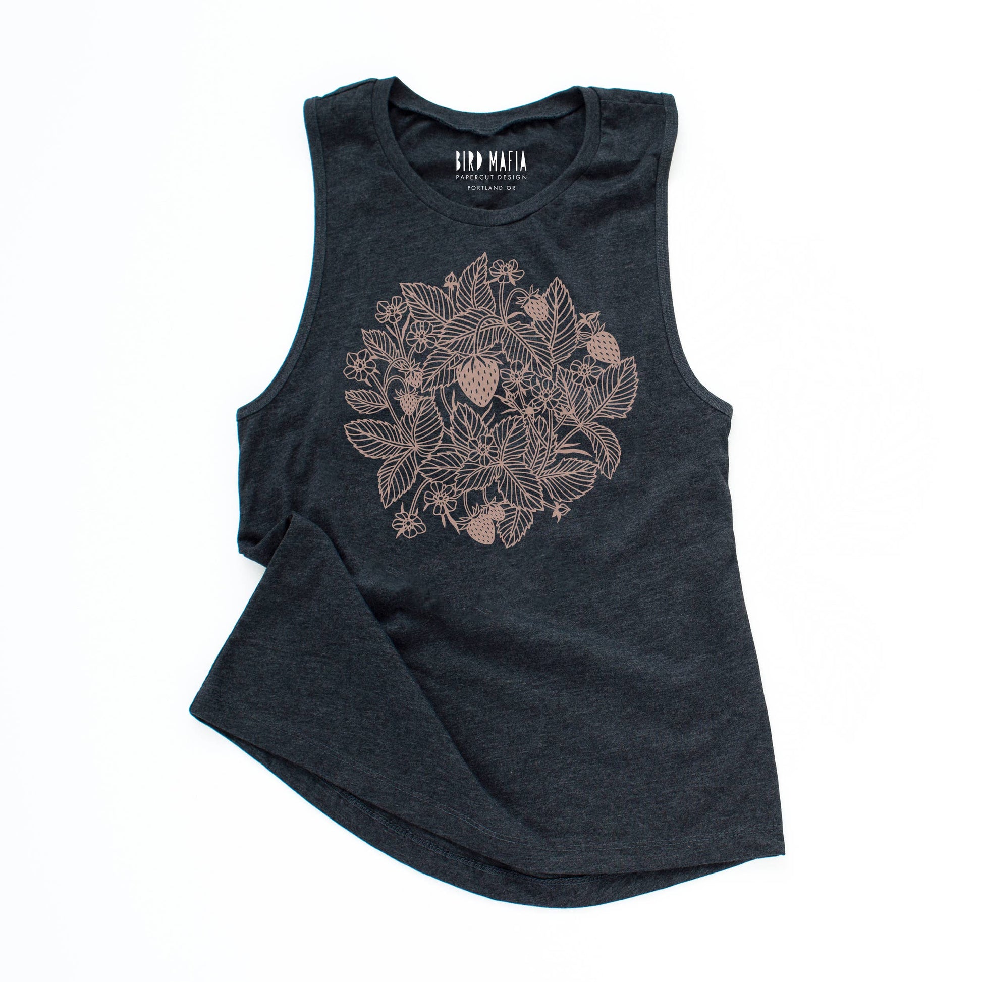 We love this comfy and casual “strawberry patch” print tank, which was cut by hand from paper before becoming a screenprint design.